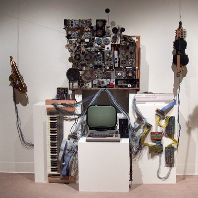 Combining digital technology with everyday salvaged materials, Trimpin has invented ways of playing everything from giant marimbas to a 60-foot stack of guitars using MIDI commands. Taking inspiration equally from the junkyard as the museum and the concert hall, Trimpin often creates these eccentric and interactive instruments from found materials, including saw blades, toy monkeys, duck calls, beer bottles, bunsen burners, slide projectors, turkey basters, and pottery wheels. Trimpin’s computer-driven musical contraptions defy the constraints of traditional instruments.