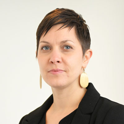 • Carrie Beyer, wearing headphones, standing in front of a microphone.