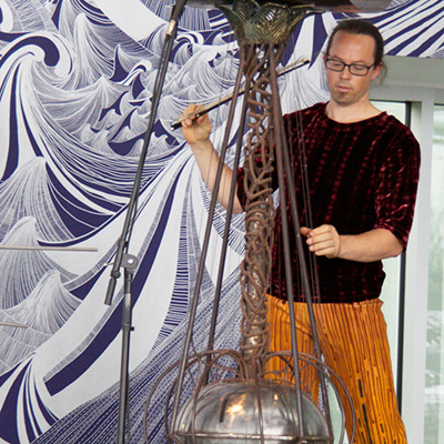In 1989, at the age of sixteen, he was awarded a scholarship to attend the Atlanta College of Art. He graduated with a BFA in sculpture in 1993. While at ACA Ela began experimenting with combining sound with form to create musical sculptures, a process that has resulted in more than forty large-scale musical instruments to date. From college onward, Ela’s art has encompassed sculpture, music, film, and movement in live performance. Ela’s artistic horizons continue to expand as he erases the lines between disciplines to create multi-faceted works that now include design and fabrication of public art, architectural design and planning, numerous recordings, short films and scores.