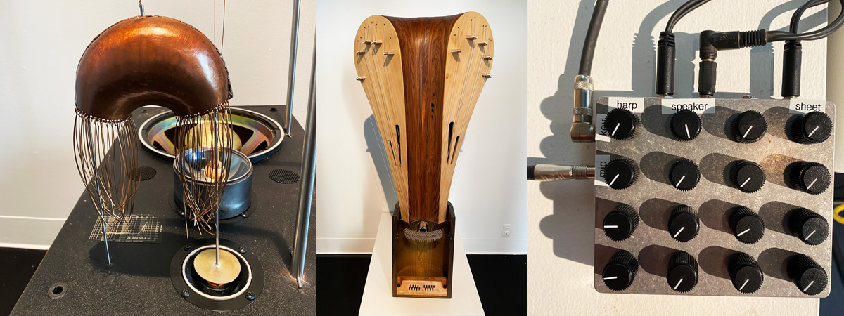 This exhibition of sculptural systems is inspired by early electronic instruments, ambient music, and biomorphic sculpture of the ‘70s and ‘80s. Some analog instruments blurred the human aspects of acoustic instruments with the precise dissonance of the electronic. This period feels relevant as we are intertwined with contemporary technologies and novel forms for expression. These sculptures transform the space they are in and can be utilized to transform sound sent through them, providing a call-and-response between the user and objects.
