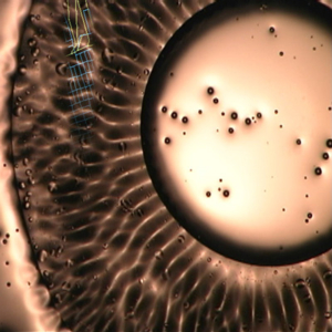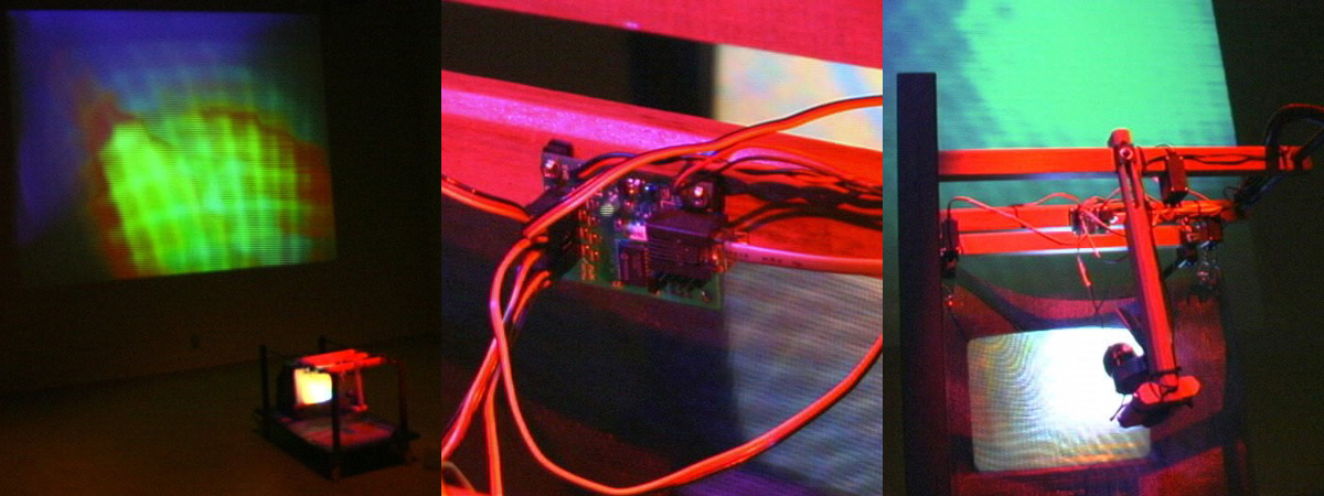 “Uroborous” is the ancient symbol of the serpent eating its own tail, an apt metaphor for this contemplative, continually transforming light and sound installation of video and audio feedback systems. The center point of the installation is Battey’s electromechanical video filter, which places computer-controlled moving screens in a video feedback loop, providing subtle moiré-pattern interference and surprising shifts of color and texture. A computer analyzes the resulting video image and responds by controlling a custom audio synthesis process developed by Battey called Compressed Feedback Synthesis. Rendered in surround-sound, the audio shifts unexpectedly from quiet whispers to shimmering curtains of sound. Grab a pillow and a spot on the floor to enjoy the continual unfolding of the Uroborous.