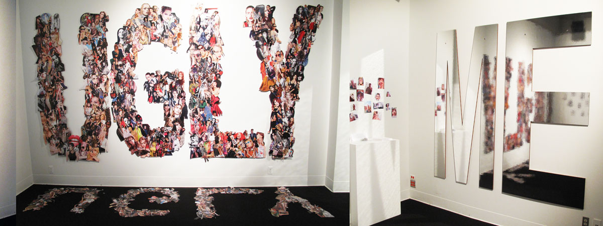 UGLY ME is a multi-media sound installation that explores the interplay between appearance and self-worth through fashion photography, distorted selfies, and spoken prose. Twelve original works read by the author play as a backdrop to a series of comical personal images and large-scale typographic collage. Visitors are encouraged to listen, linger, and contribute their own selfies to the investigation.