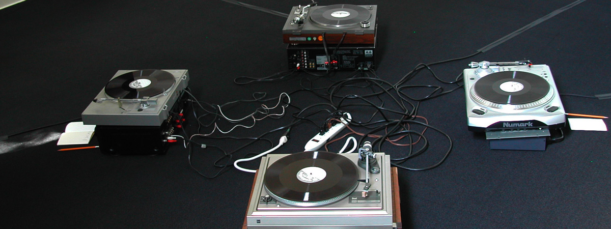 Felt is an investigation into how matter, form and surface hold, reveal, and alter what they contain. Four 12″ dubplate records on four separate turntables, each with its own sound system, may be played by visitors to the gallery – one at a time, all at once, or in any combination. Two are piano recordings by improviser Gust Burns and two are poems by Melanie Noel. The dubplates will disintegrate slowly over the course of the installation. As the surface material breaks down so does the sonic material, altering what is heard when what is heard is already uncertain depending on which records are played in what combinations.