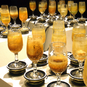 Every Island Fled Away and the Mountains Could Not Be Found is an installation for sound constructions and corroded photographs, collectively acting as a metonymic, divergent presentation of how vibrations affect the surface of water. The audio component features a multi-channel sound construction of numerous 3.5 inch speaker cones with small wine glasses resting upon the cone of each speaker. These wine glasses in turn would be filled with variable solutions of cupric sulfate, aluminum chloride, rust, and water. In pushing very low frequencies through the speakers and up through the stem of the glass, the ensuing vibrations would cause variable patterns to appear on the surface of the liquid. The choreography of these vibrating surfaces is complemented by seven composite images of corroded photographs, which has bruised and contaminated by the same chemicals found within the solutions found in the sound constructions. While these images describe similar undulations of watery surfaces, the corrosive process has been so extensive as to obfuscate and abstract those buried images.