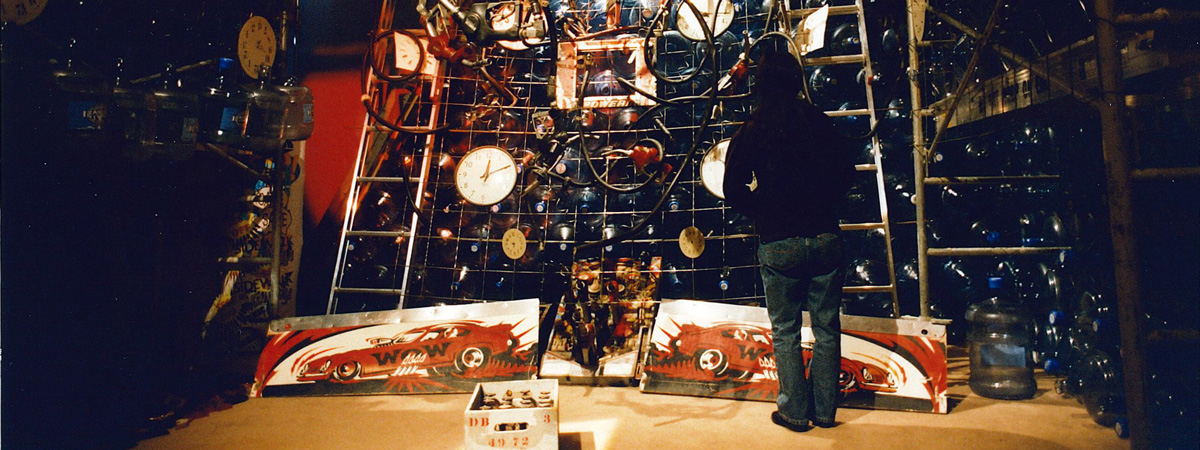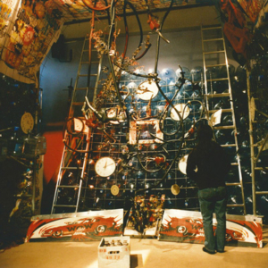 Salmon Song, created as part of the Salmon in the City project, comments on the despiritualization of salmon and the desecration of their habitat. The mixed media installation creates an artificial environment consisting of a central double helix shape of gas pump hoses and nozzles suspended from the ceiling which surround a school of hatchlings represented by salmon cookie cutters. The empty shapes suggest the salmon are lost due to the dynamics of commercial enterprise, leaving behind ghostly frames. All four gallery walls are plastered with a gamut of advertising signs, characterizing the environmental challenges the fish face at birth. Classical music and soothing water sounds emanate from quadraphonic speakers and provide a counterpoint to the loud and visually aggressive images. From the first floor of the Jack Straw building, TV sets facing toward the street play video footage of rivers and waterfalls.