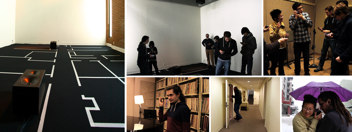 Wireless network spaces co-exist with physical spaces but follow their own rules, which are not always intuitive from the point of view of physical experience. To explore and navigate them a new sense is needed, as vision falls short. In nature, many animals that inhabit environments where vision is not a sufficient navigational tool – such as bats and dolphins – have developed echolocation, transmitting sound and listening to the echoes of the space. The Network Is a Blind Space creates a type of musical echolocation to explore this hidden dimension within the particular spatial configuration of Jack Straw. Devices joining the network become part of the space as active nodes and resonant objects; each can be heard individually as its sound is played from a dome of speakers hanging from the ceiling of the gallery. The state of the system, from the point of view of each of its two computers, can also be listened to via two speakers located on the gallery floor – where the architectural plan of Jack Straw is marked out with tape – each at the respective spot of the computer it represents. Additionally, iPods and iPhones can be used as sound-making echolocation sonars after installing an application.