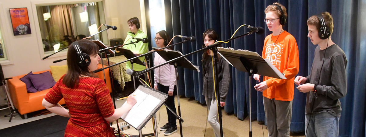 Working with our team of writers, engineers, sound artists and vocal coaches, students write scripts, choose parts, rehearse, perform, and record radio dramas, including sound effects and music, which help illustrate the images, feelings, and setting of their pieces.