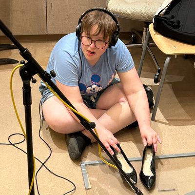 A person seated on the floor holding a pair of shoes on a sheet of clear plastic, with a microphone pointing toward the shoes.