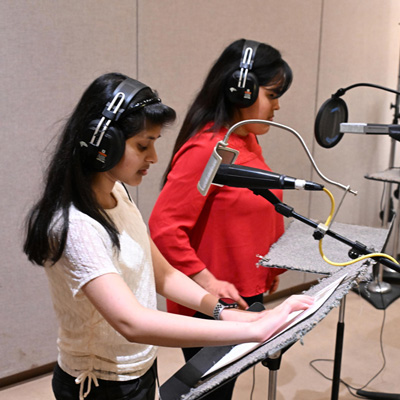 Two people wearing headphones standing at microphones. One holds her hands on a sheet of white paper on a music stand.