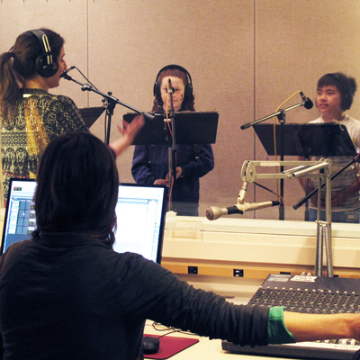 Two students stand at microphones looking at Alyssa Keene, also at a mic. Engineer looks on from the control room, looking at a computer monitor, her arm out to the right.