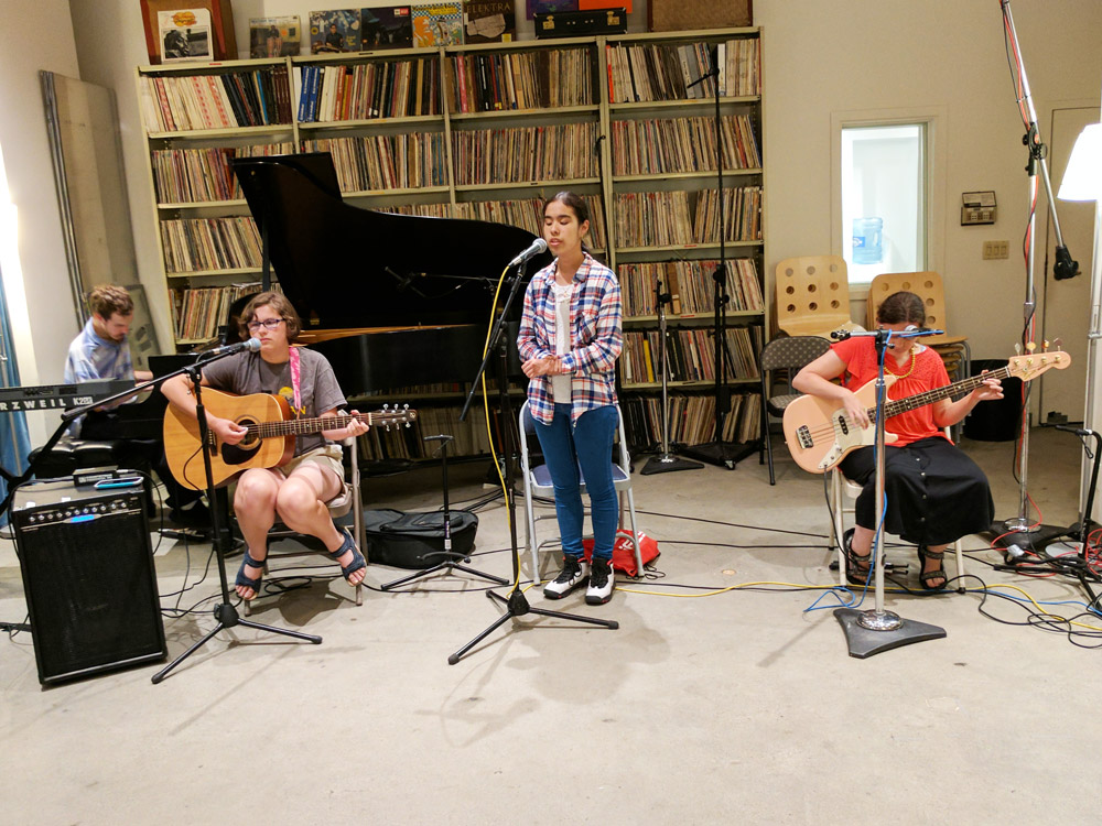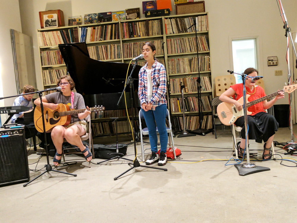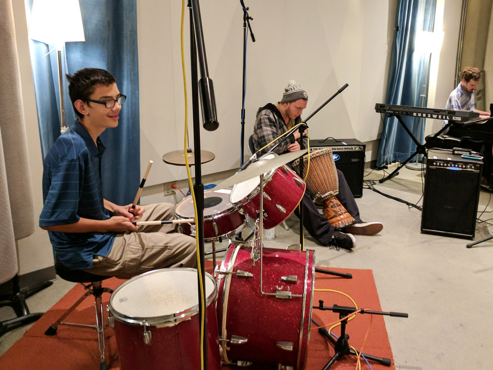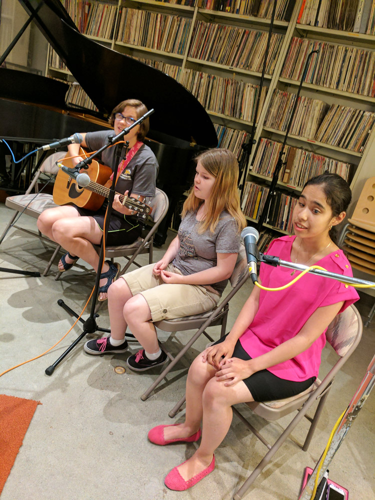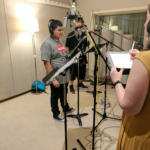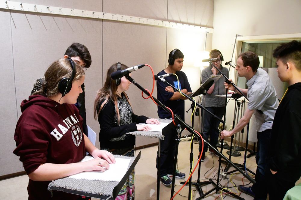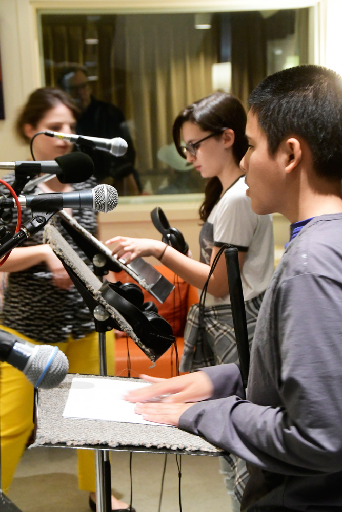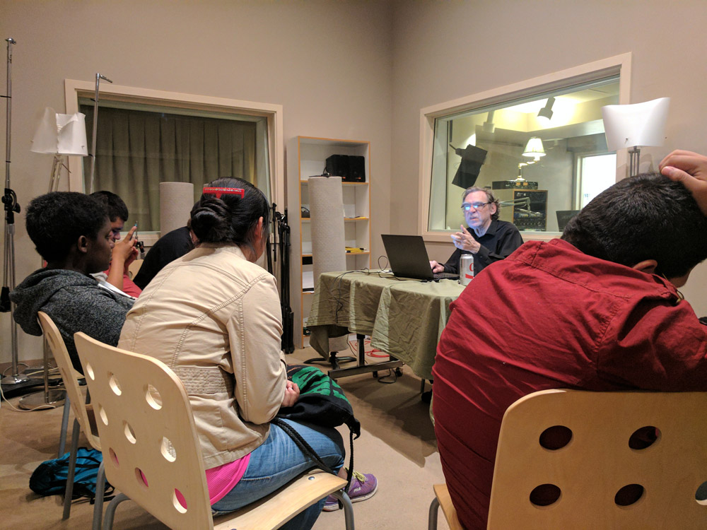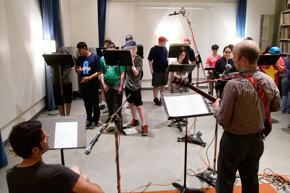 Over the following weeks, high school students worked with Jack Straw teaching artists to write and record original music and radio drama in the Jack Straw studios. Musicians Bill Horist and Jessica Lurie collaborated with one group of students to write and produce an original song, “Dear Friend.” Writer Jesse Minkert, vocal coach Alyssa Keene, and engineer Daniel Guenther with the drama group of students to create an original radio play, “Downtown Tragedy.”