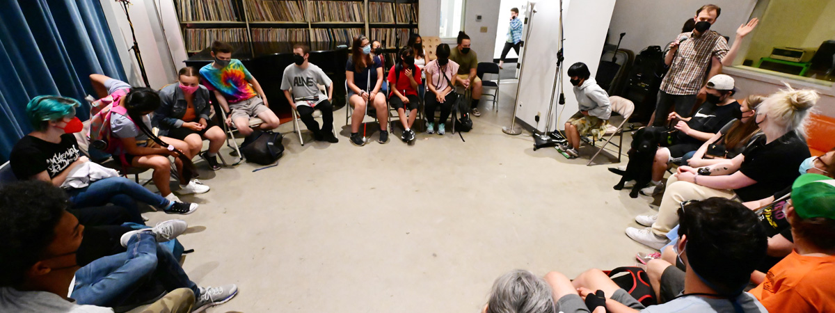 During the opening session of the 2022 Blind Youth Audio Project, a group of 17 students worked with Jack Straw’s artist team of audio engineers, musicians, vocal coaches, and writer to create two flash dramas and learn about the program. After all participants introduced themselves, the group listened to past Blind Youth drama and music productions. Then, the group divided into three teams to begin vocal recording and music composition.