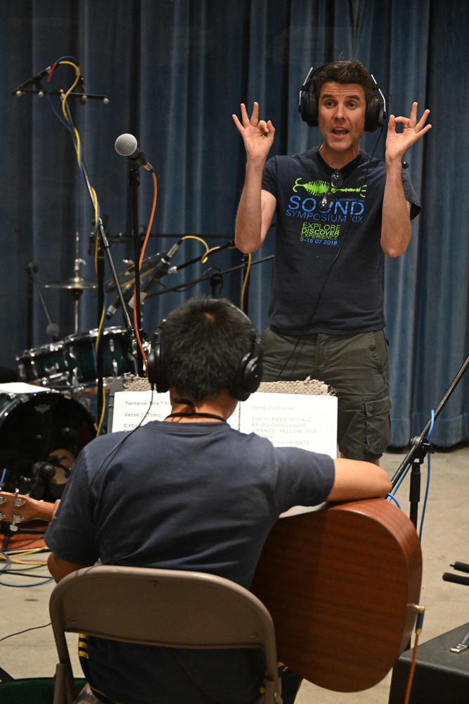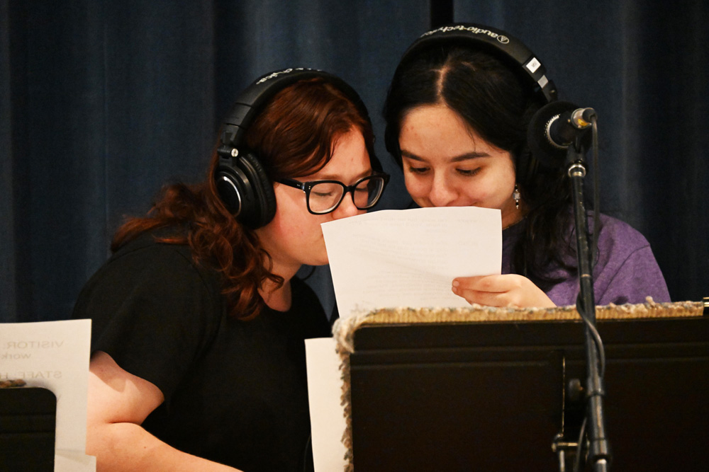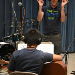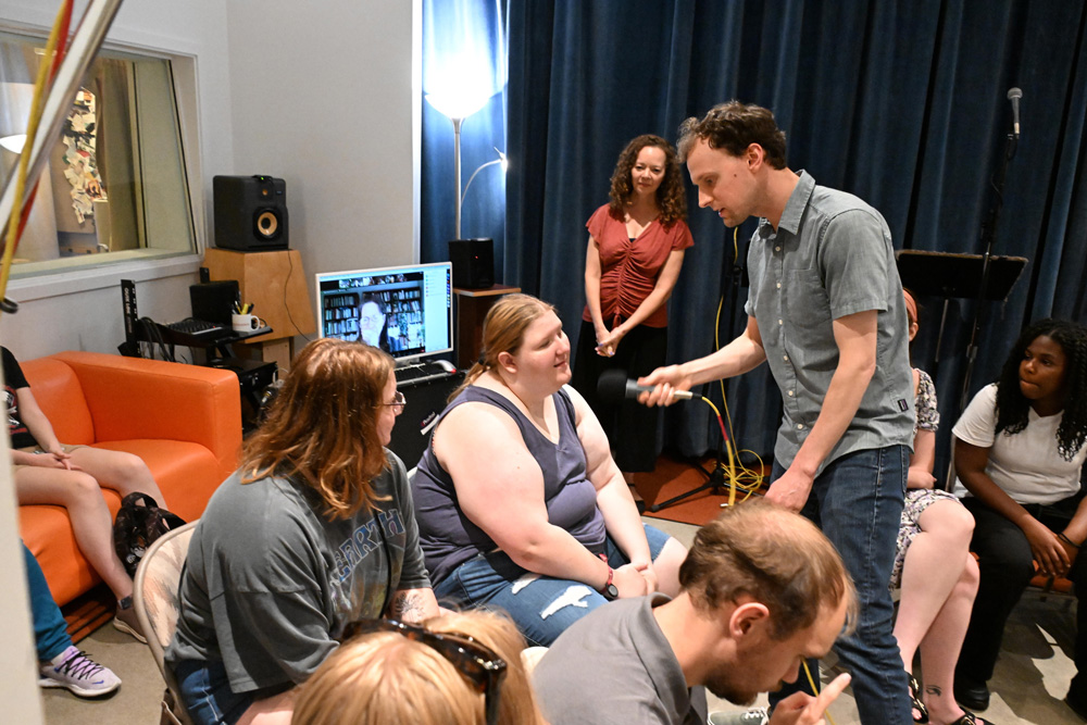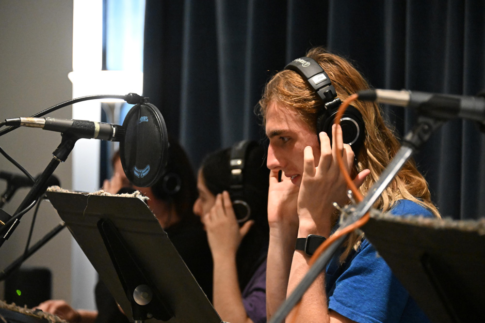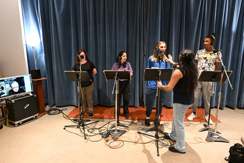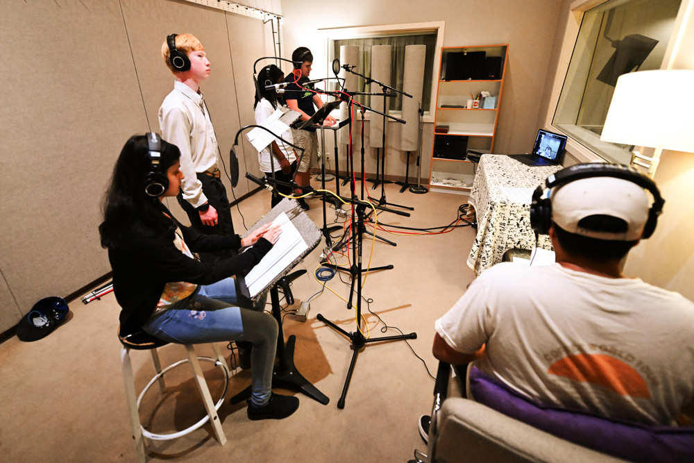 The first group produced “Service Animals Are Allowed Anywhere” in Studio 1 with engineer Ayesha Ubayatilaka and producer Carlos Nieto, with Jesse Minkert and vocal coach Brenda Arellano joining via Zoom. The second group worked on “The Bus Thing” in Studio 2 with engineer Daniel Guenther and vocal coach Gin Hammond. The third group worked with musician Bill Horist and studio intern Erin Shellman, with musician Jessica Lurie joining via Zoom, to compose original music to accompany the two PSAs.
