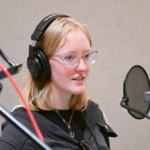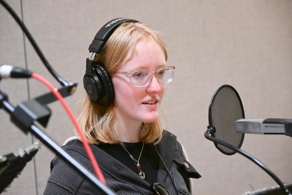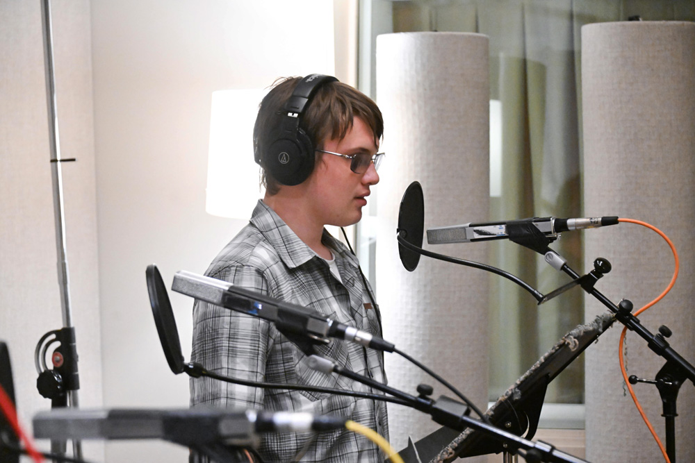 A student wearing glasses and a baseball cap sits holding an ukulele, a microphone in front of him.For this year’s Blind Youth Audio Project, we welcomed blind and visually impaired students from across the state into our studios for a series of in-person music and radio theater workshops.