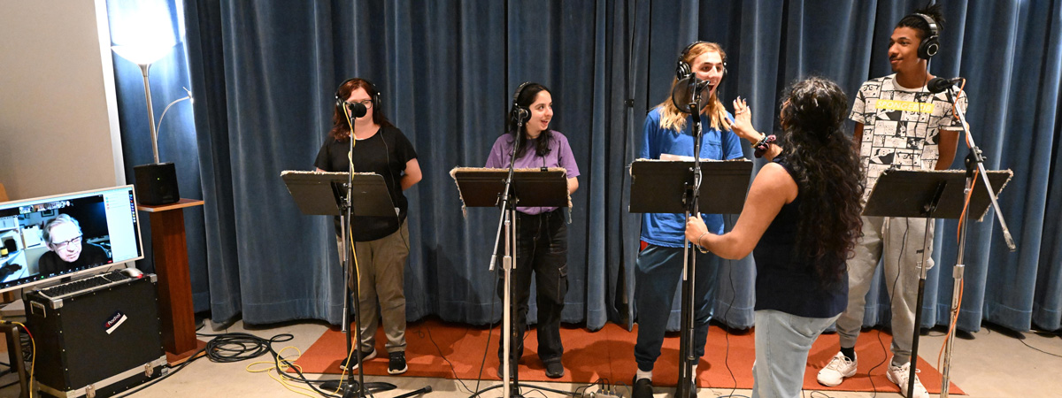 A group of four students stand at music stands and microphones as an engineer faces them, adjusting a microphone. A computer monitor on the left shows a face in an online meeting.