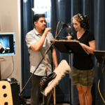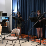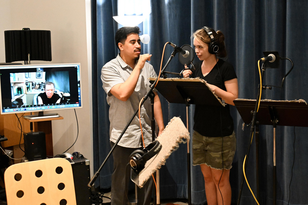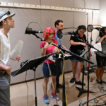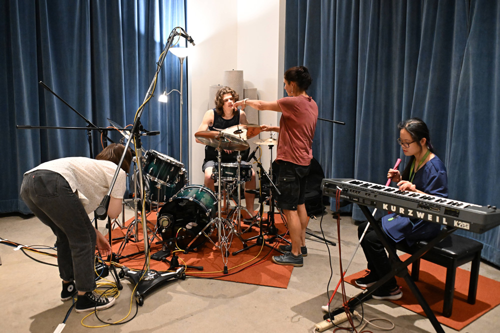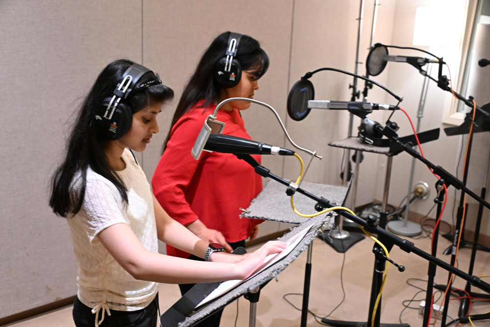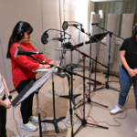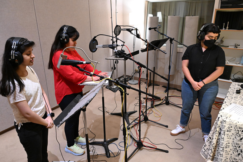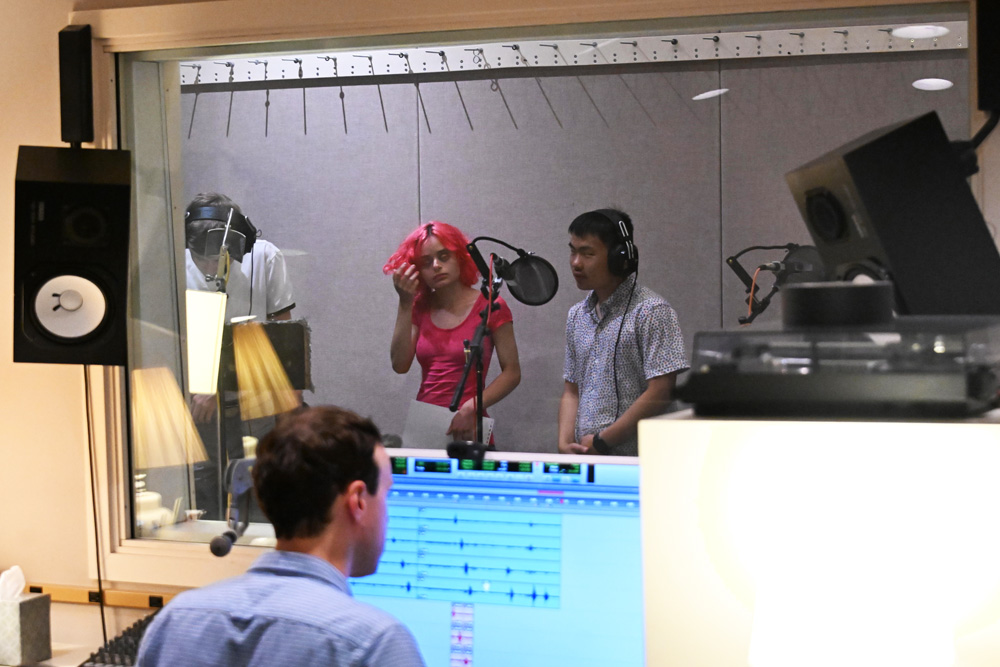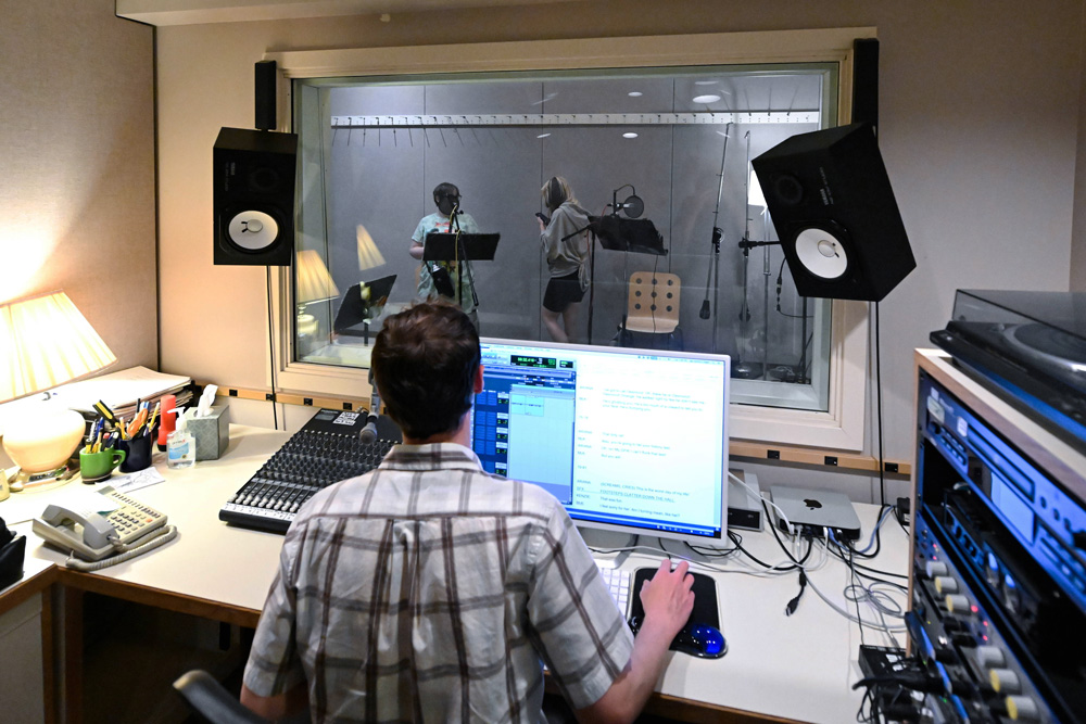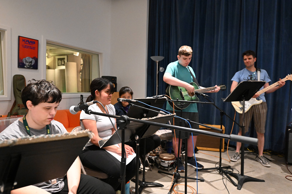 The first group produced “Handshake Translator” in Studio 1 with engineer Ayesha Ubayatilaka, producer Carlos Nieto, writer and drama coach Jesse Minkert, and vocal coach Meg McLynn. The second group worked on “Which Is True?” in Studio 2 with engineer Daniel Guenther and vocal coach Stephanie Roman. The third group worked with musicians Bill Horist and Jessica Lurie and engineer Erin Shellman to compose original music to accompany the two PSAs.