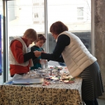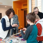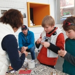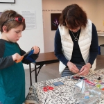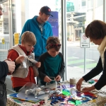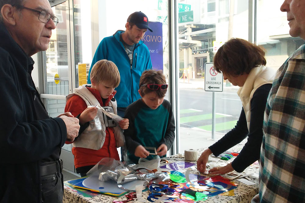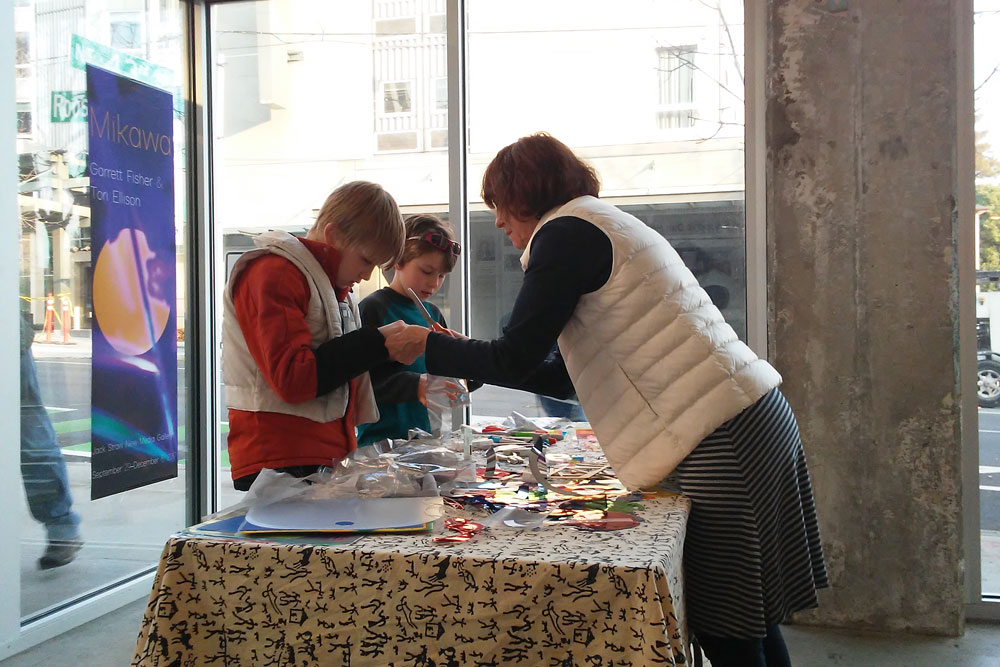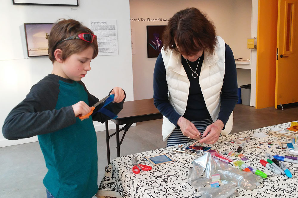 After the workshop participants had had a chance to experience the installation, Tori helped the group explore translucency and light, cutting and layering colored acrylic sheets and sheer fabrics into collage elements, to be placed in windows or hung as mobiles. The work was then hung in the gallery as part of the installation.