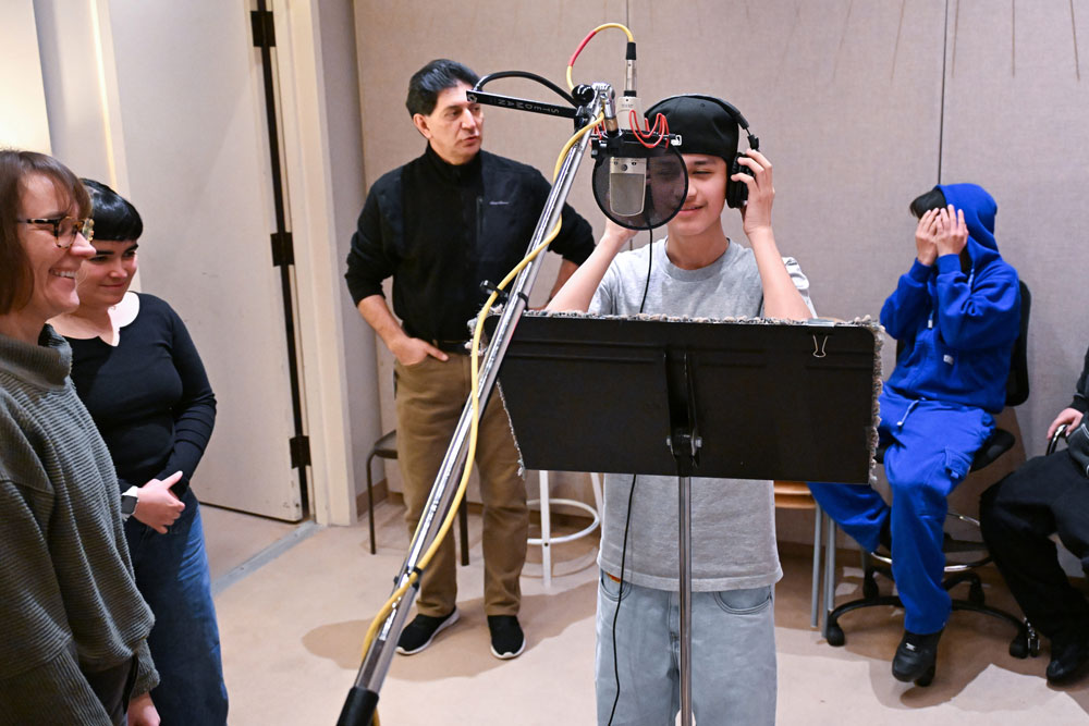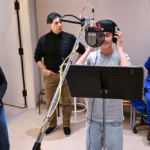 Vocal coach and Denny student wearing headphones in a recording studio with a microphone.