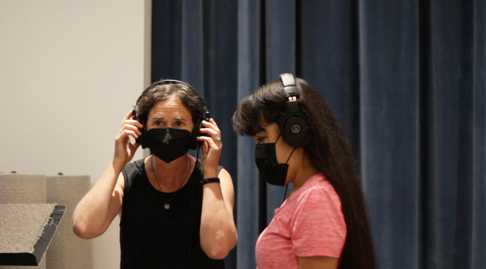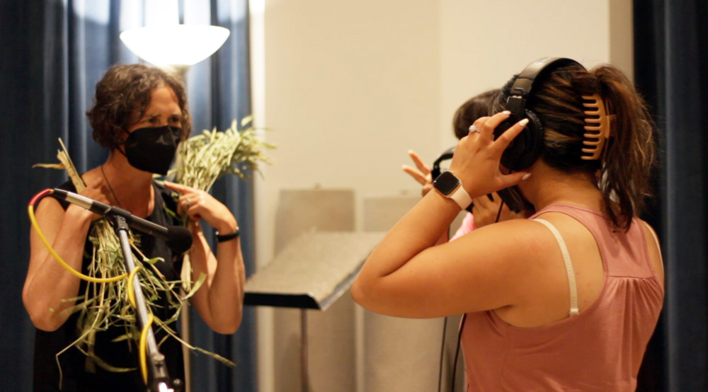 Participants experienced Perri’s work in the New Media Gallery with an audio description by Jesse Minkert of Arts and Visually Impaired Audiences. After exploring Perri’s installation and hearing her talk about her process and inspiration, participants learned about the world of foley recording in the Jack Straw studios with Perri and Jack Straw engineer Daniel Guenther. Participants explored the sounds of various objects and listened to the results of recordings they had made with both microphones and hydrophones. Next, they recorded short vocal phrases inspired by On Our Watch. In the final step, students’ foley and voice recordings were blended together to create an original soundscape.