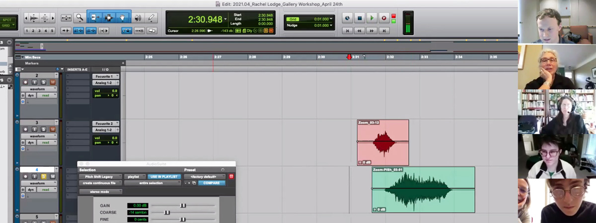 After sharing her process and inspiration for creating Transfigurations: Carbon Flow, participants used their voices and household objects to record words and sounds inspired by nature to create a new soundtrack to accompany Lodge’s installation. Participants also learned about audio editing and mixing using digital software to create their piece.