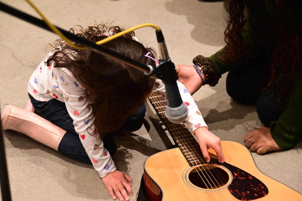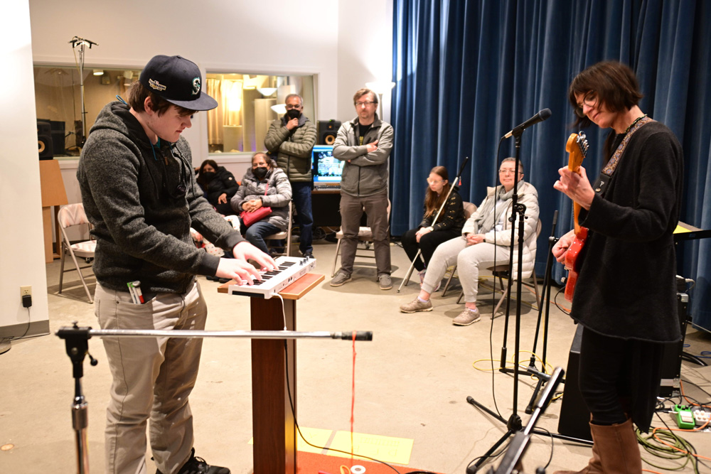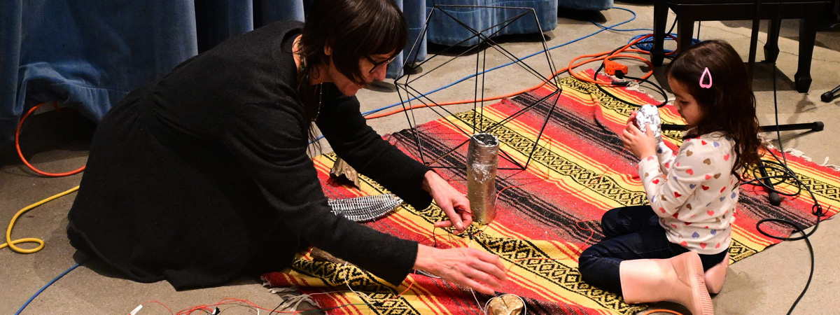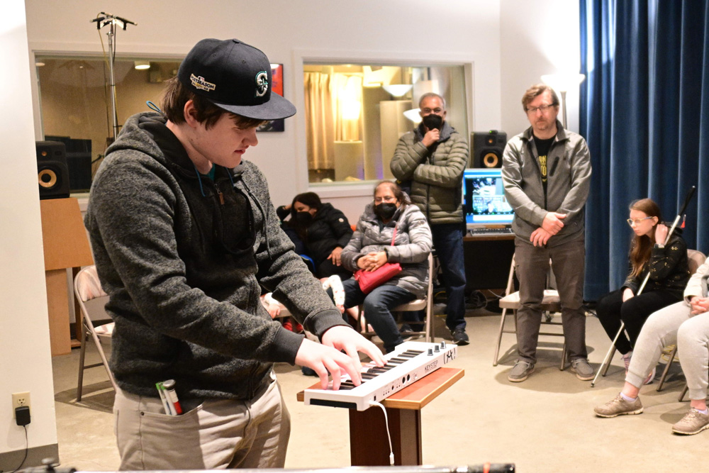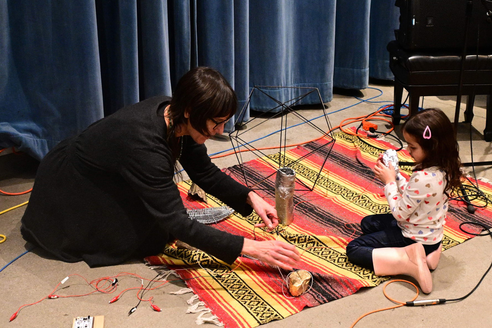 After exploring the installation and hearing about Sasha’s process and inspiration, participants learned about the concept of data sonification and how numbers can be translated into sound. Sasha and Jack Straw engineer Daniel Guenther guided attendees through the process of recording short musical samples, which were then manipulated and looped into an original soundscape. Before concluding, participants had the opportunity to explore the recorded samples and create their own unique mix.