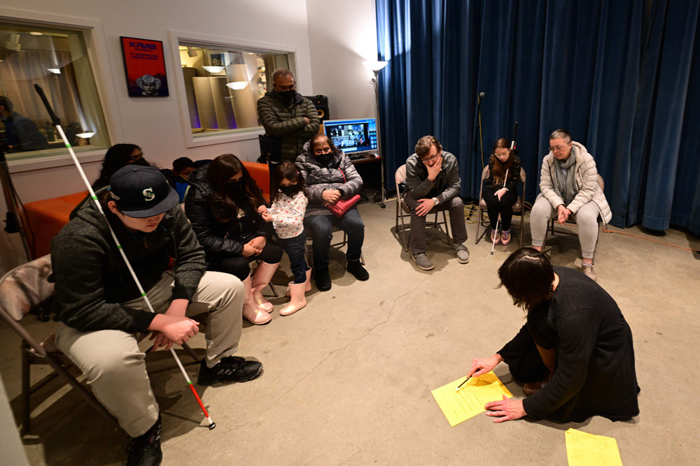 In March 2023, Jack Straw and Arts and Visually Impaired Audiences (AVIA) presented an accessible youth and family art workshop at Jack Straw in conjunction with Sasha Petrenko’s New Media Gallery installation, Forest Time Water. Participants experienced Sasha’s work with an audio description from Jesse Minkert of Arts and Visually Impaired Audiences.